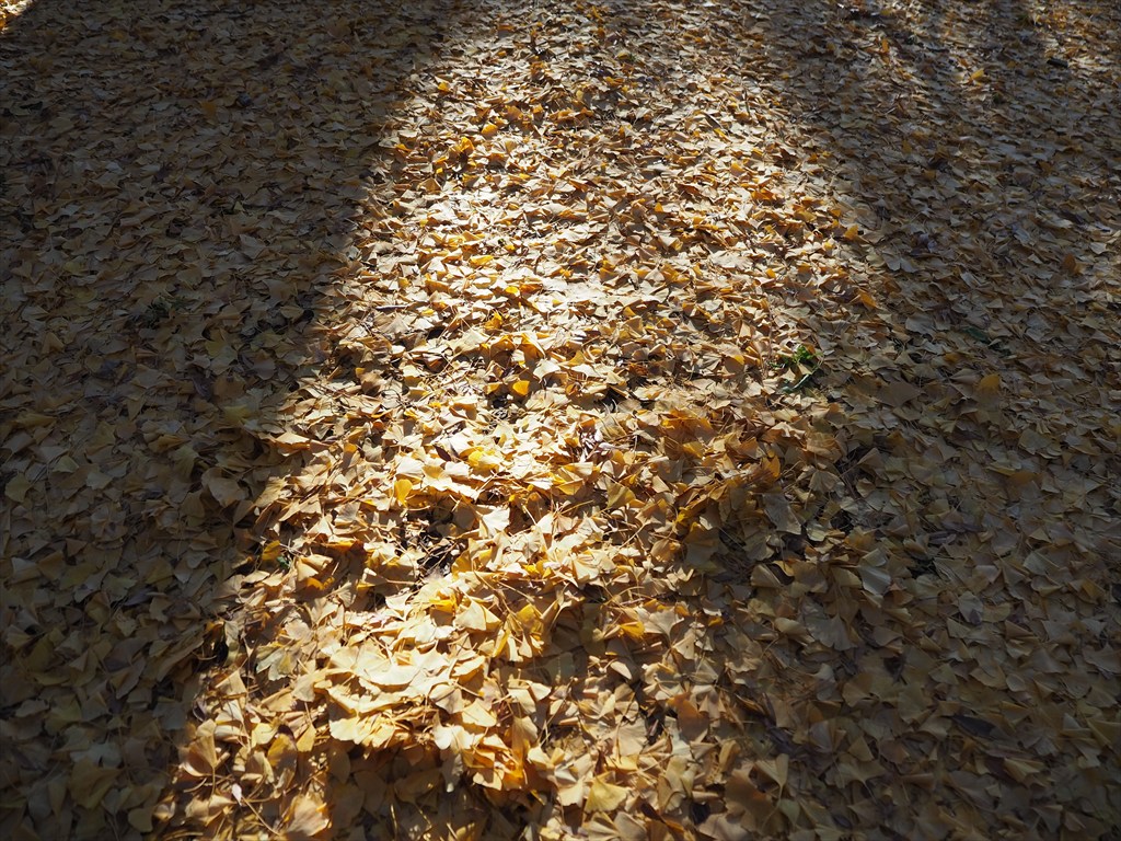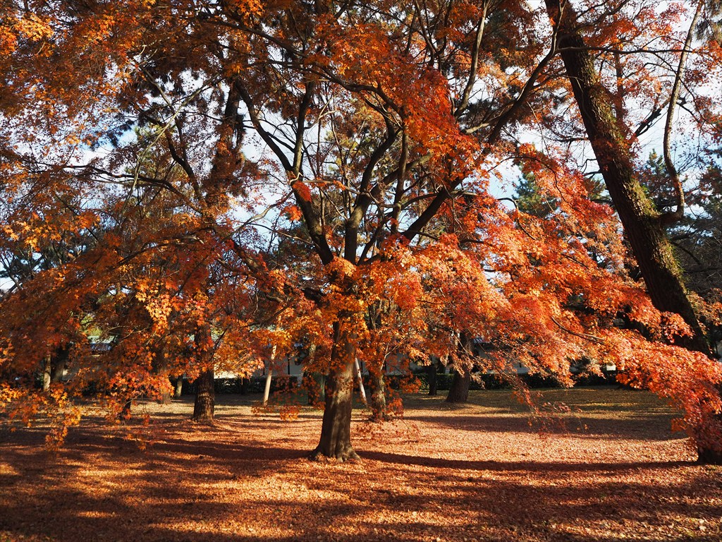 京都の紅葉は概ね終わっていますが、京都御苑を訪れると名残りの紅葉が見られました。イチョウも散っていましたが、散った葉はまだ黄色く、地面を覆う様子に最後の秋を感じることができました。