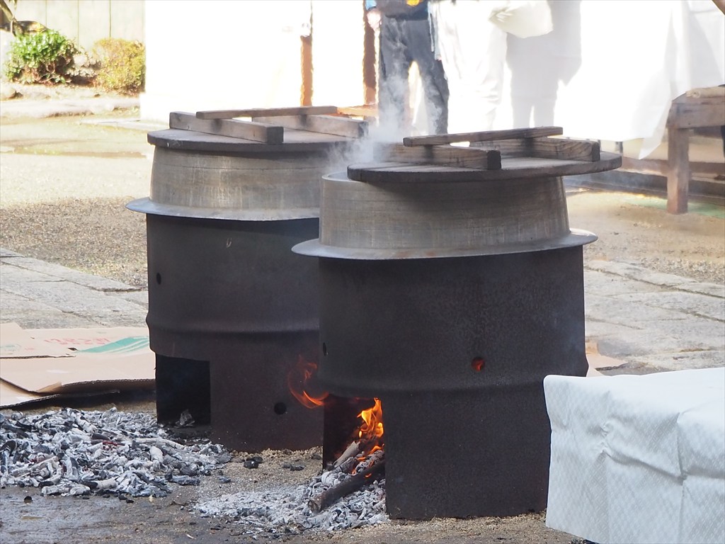 釜で炊かれたお粥は口当たりがまろやかで、お粥には梅干しやお漬物などをお好みで加えることもできました。地元の方々やお粥接待やご開帳を目的に訪れた方々など、皆でいただくことができました。
