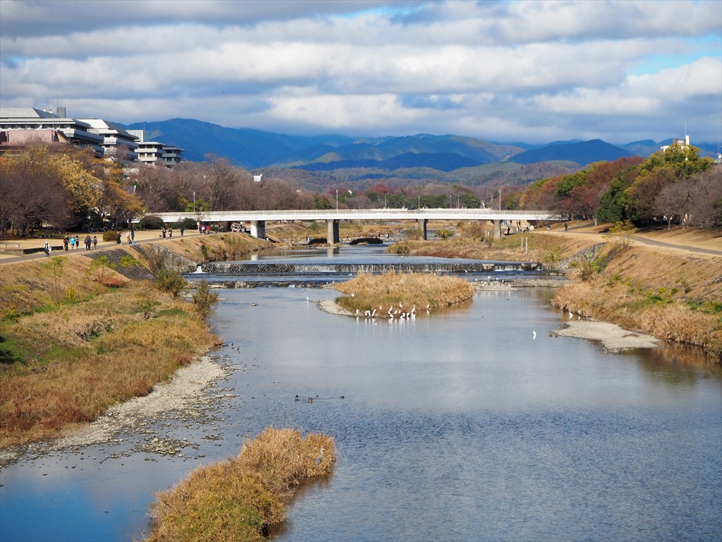 冬の鴨川は、川に映る青空が冷たい空気をより印象付けてくれるようです。コサギやカモなどの鳥が行き交い、穏やかな雰囲気もあります。人は年末年始で忙しくなりそうですが、しばし心が癒されました。