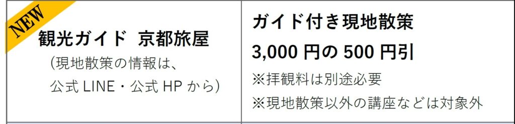 現地散策の詳細は、ホームページの「季節の京都散策」からご覧ください。また、LINE公式アカウントを友達登録いただくと、京都旅屋の散策・講座情報を配信させていただきます。なお、申込完了メールでは3000円と表示されますが、ご参加時の合格証の提示で500円引きとさせていただきます。