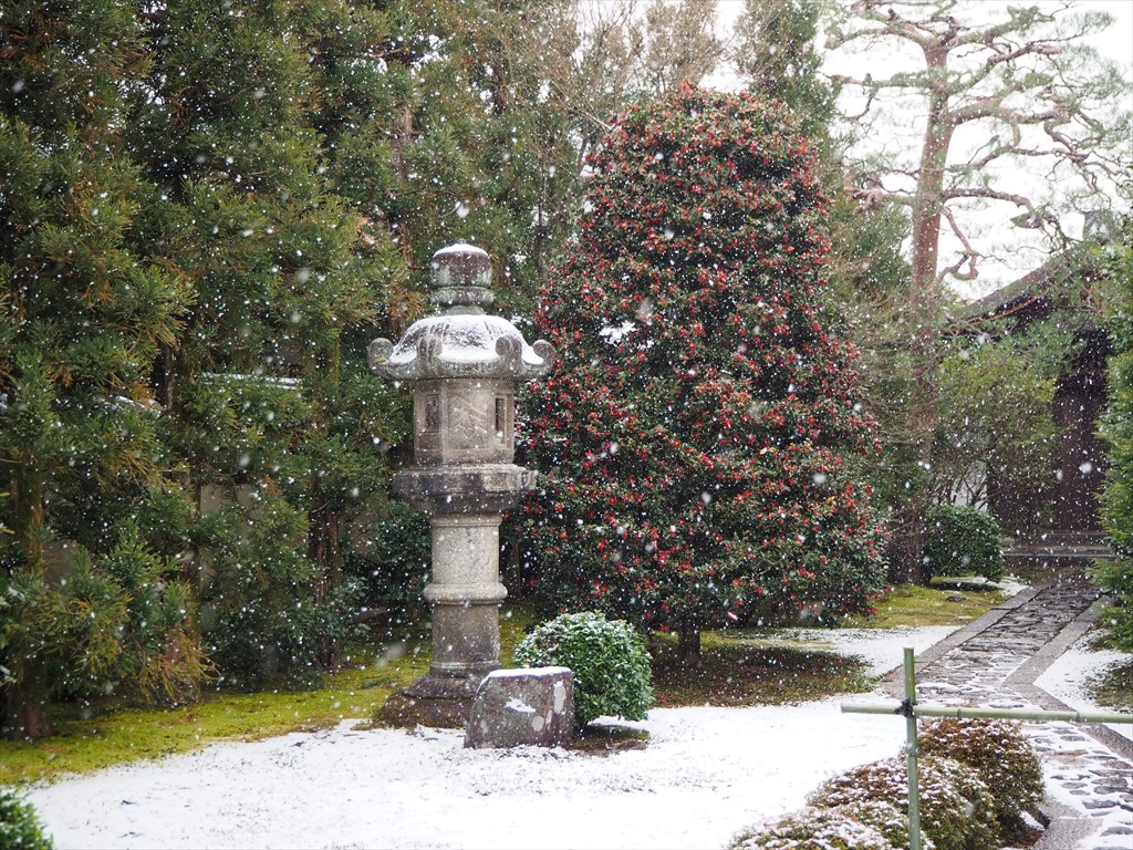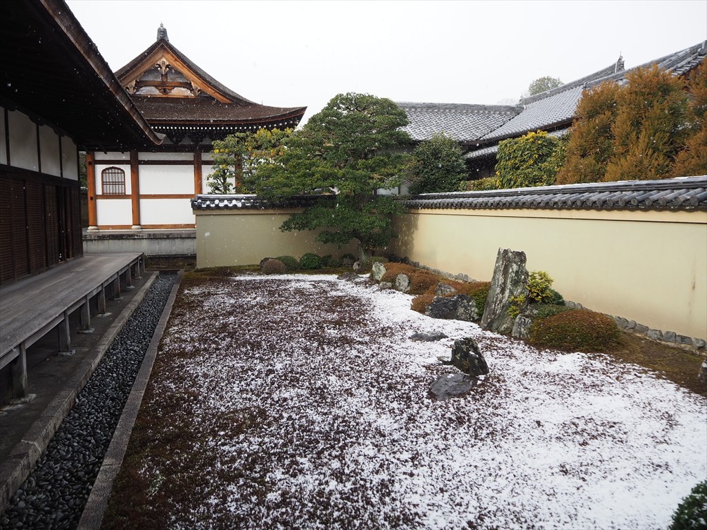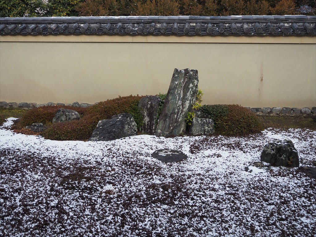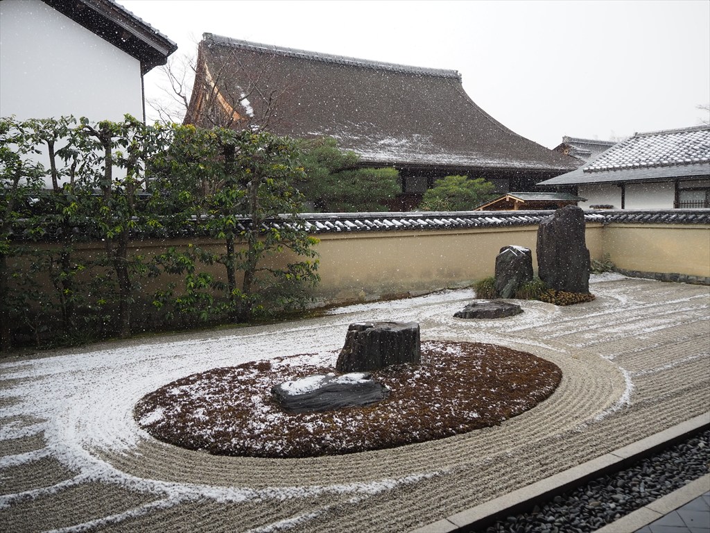 龍源院は、常時公開されている塔頭で、1502年に東渓宗牧(とうけいそうぼく)を開山として創建されました。方丈の南側は昭和55年に築かれた枯山水で一枝坦(いっしだん)と称されて見事です。訪れた日は雪化粧しており、人影も少なく静かに眺めることができました。
