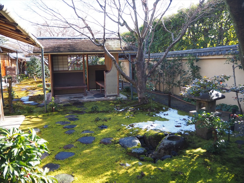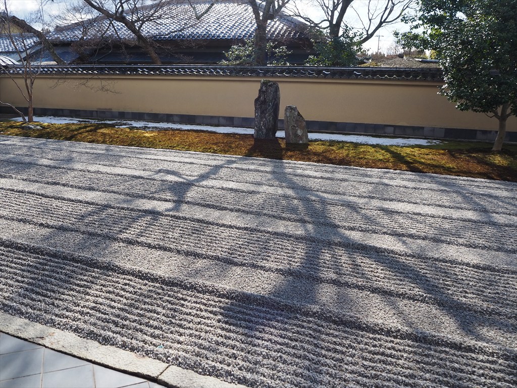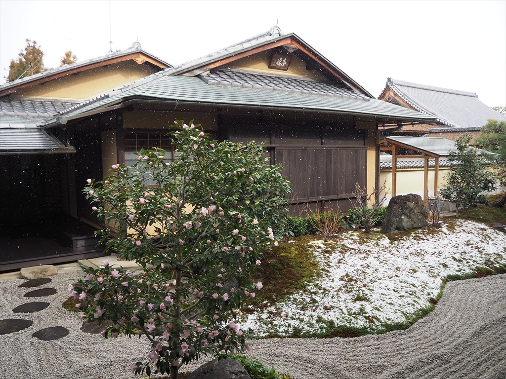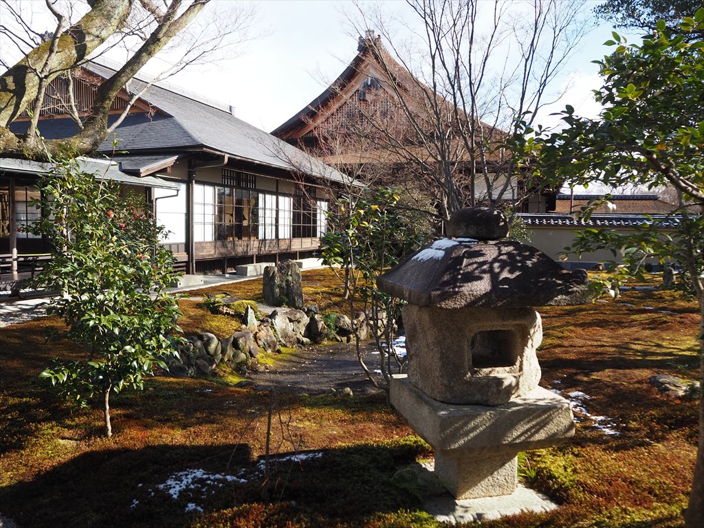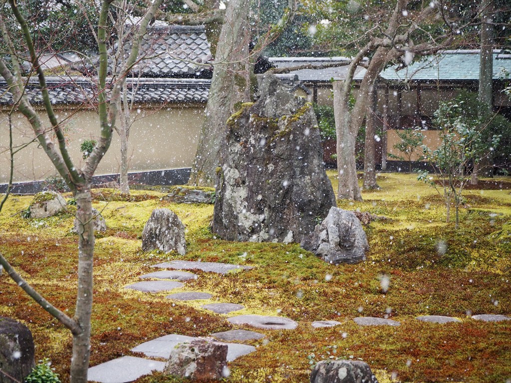 冬はカエデの葉が落ちて、境内全体が明るく感じました。この日は北山しぐれの雪が舞い、濡れた苔がより一層美しく、日差しは暖かく感じました。冬の黄梅院もおすすめです。