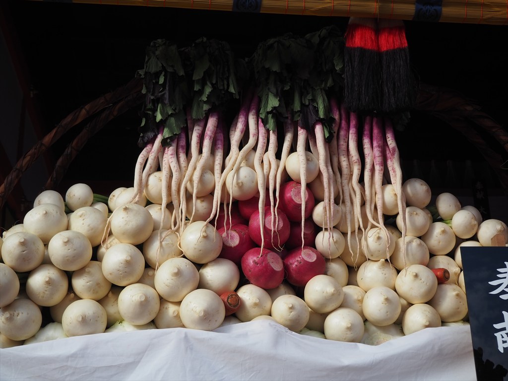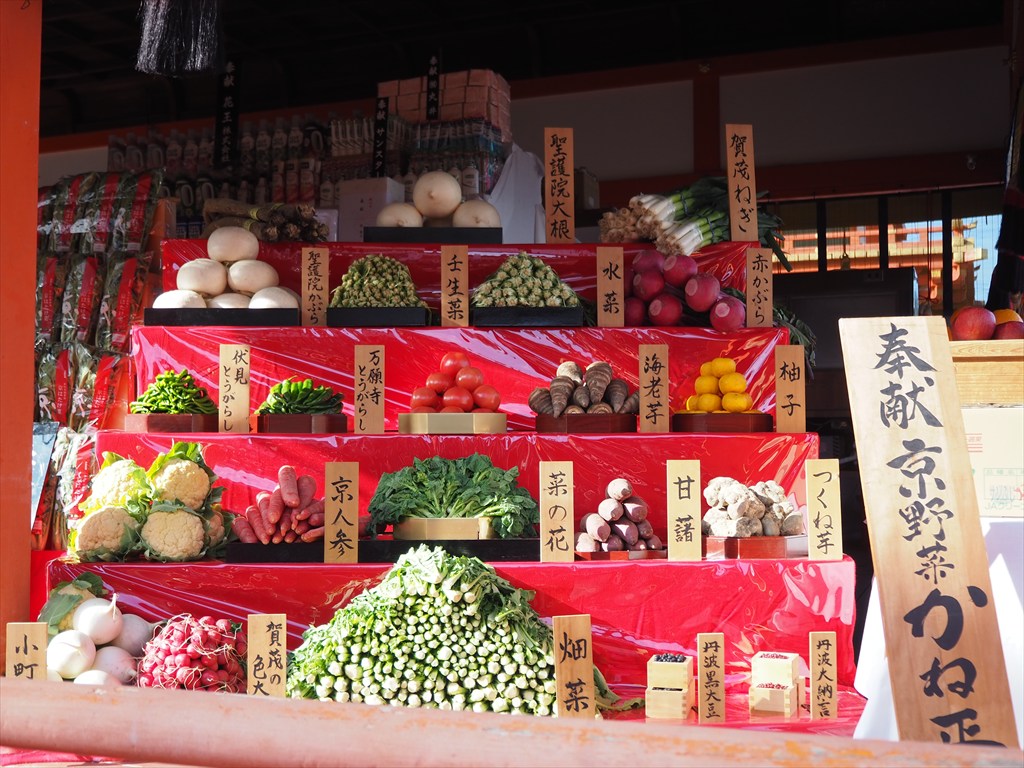 さて、昔は初午の日の前日から賑わっていた初午大祭。外拝殿には奉納されたお酒がズラリ。さらには野菜や果物といった生鮮食品が山盛りに並べられています。それにしても、ものすごい量の奉納の品々。今も昔も変わらぬ信仰なのでしょう。