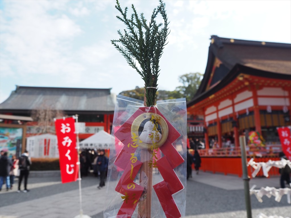 現在の伏見稲荷でも2月初午の頃に、縁起物の「しるしの杉」が授与されており、商売繁盛・家内安全のお守りとして多くの参拝者が買い求めていきます。まさに初午の日に参拝した「しるし」ですね。本来はこの杉を庭に植え、根付かせるのが習わしだそうですが、現在は御幣として飾るものとなっています。しるしの杉にはオカメさんのような顔も付いていて、これは「巫女」だとか稲荷三神の「大宮能売大神(おおみやのめのおおかみ)」だといわれています。個人的にも一本手に入れました。京都旅屋の発展を祈願したいと思います。