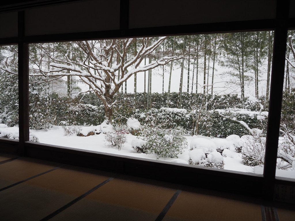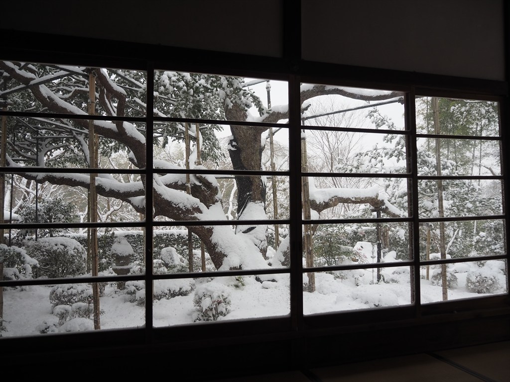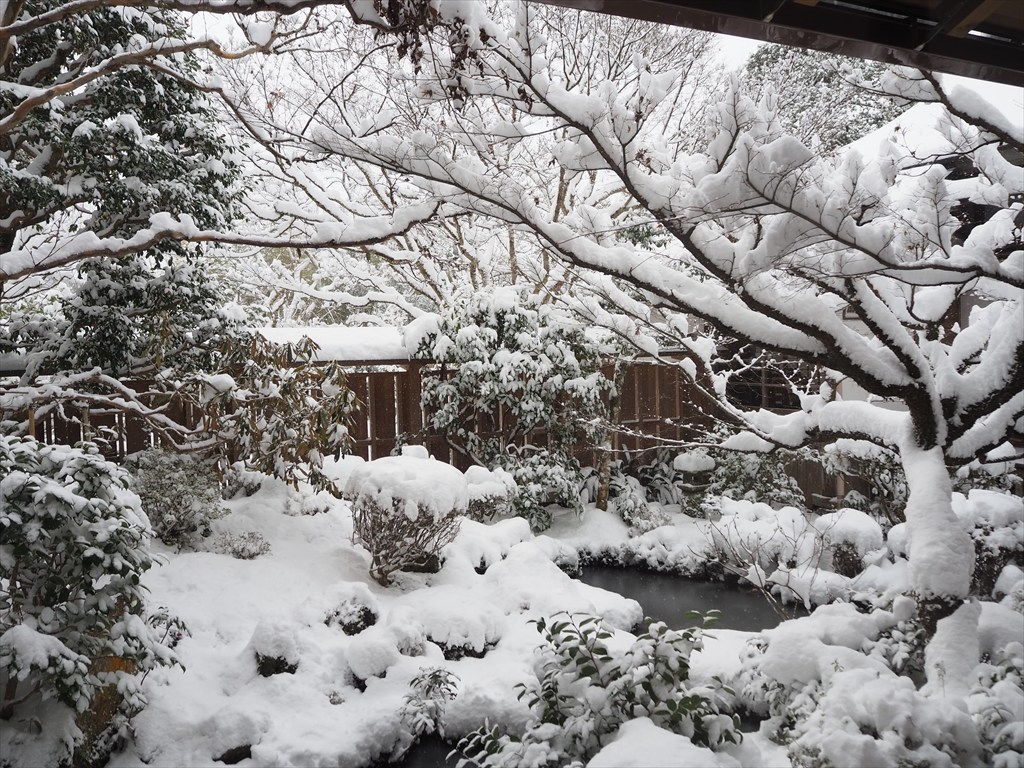 見事に雪をまとった五葉松。各方向へと伸びるどっしりとした枝ぶりは、歴史の深さを感じさせます。また、松に向かって右手側の西側の眺めは竹林やカエデ枝ぶりも綺麗で、雪の眺めも抜群です。