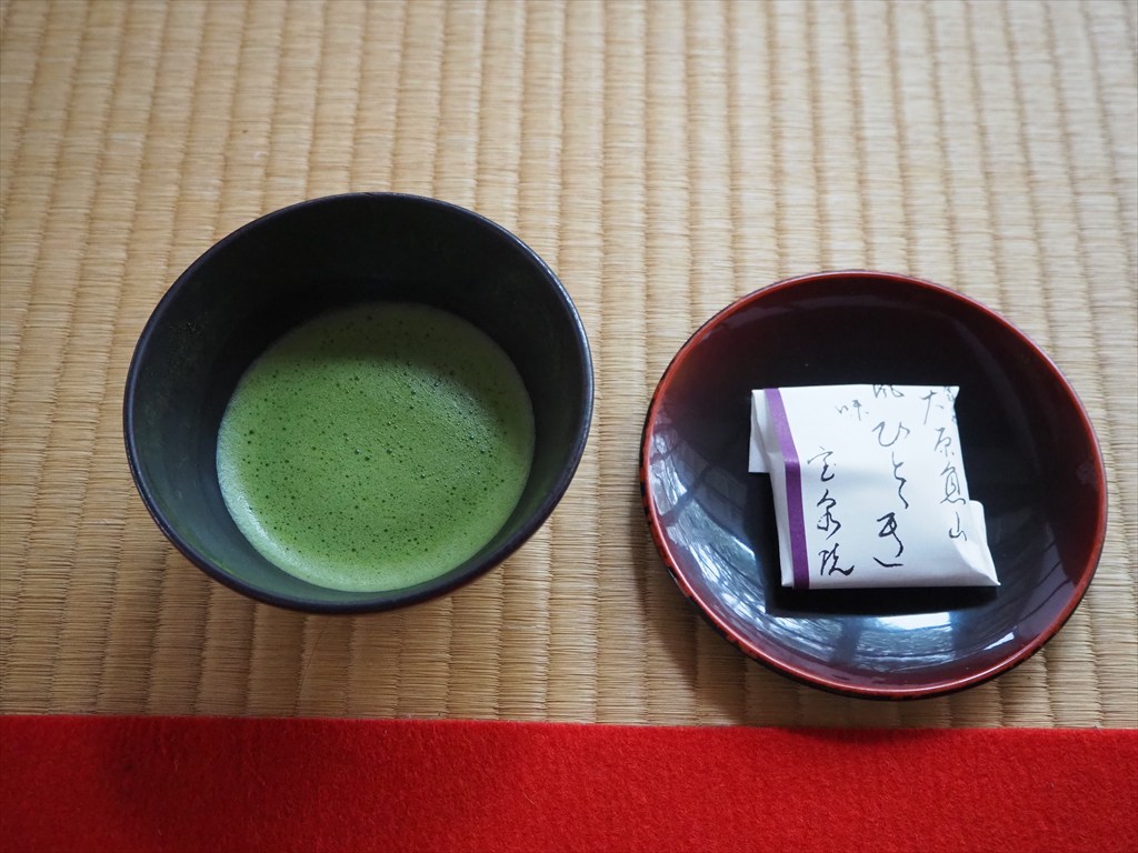 宝泉院は大原の中でも人気が高いお寺です。最近は海外の方が多く訪れ、三千院に次ぐ人気のお寺と言ってよいでしょう。拝観では必ずお抹茶がついており、樹齢700年余りを数える、京都でも有数の古い松の巨木を望む庭園を眺めながらいただけます。