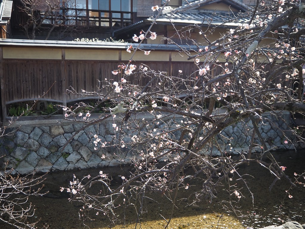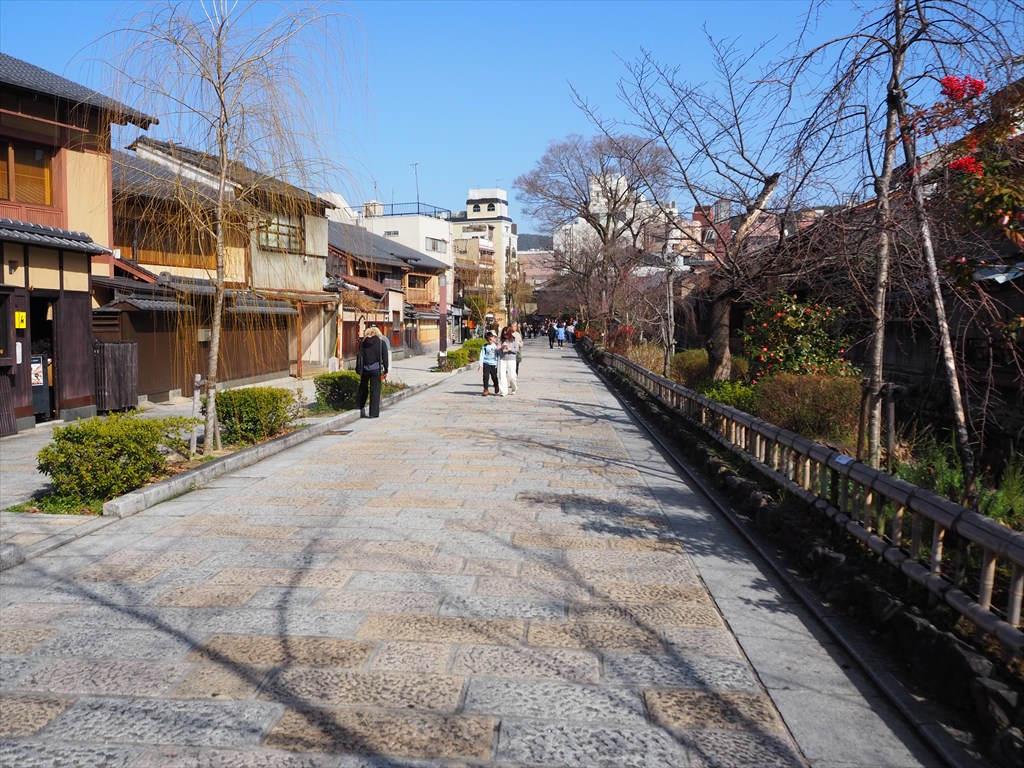 広い祇園のエリアの中でも四条通の北にある祇園白川(新橋)は、京都らしい石畳や町家の風情を比較的人が少なく感じられる場所です。春は桜の名所として有名ですが、冬場は木々が葉を落として明るさを感じられます。