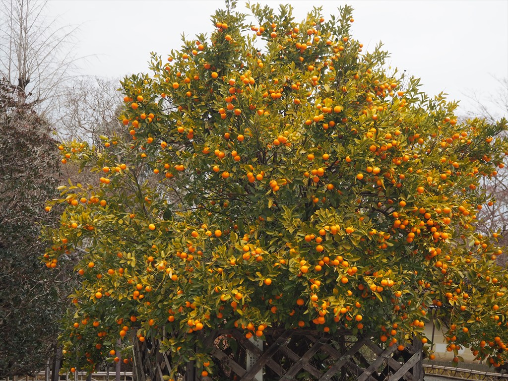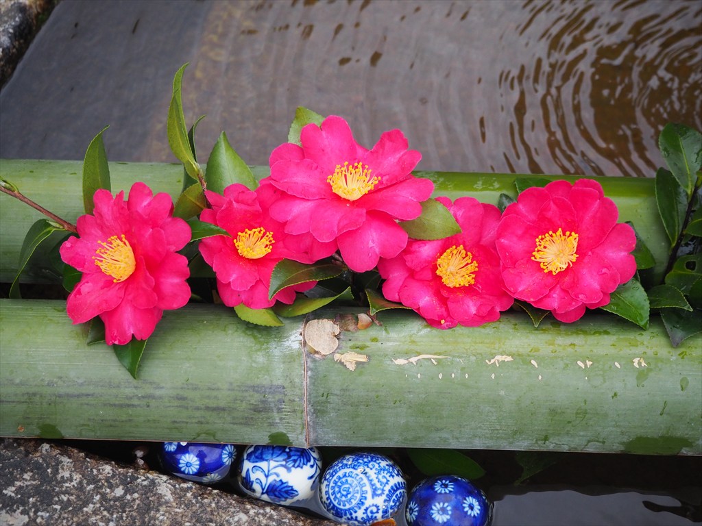木々が葉を落としている境内は、見通しがよく、人は少ないため静かに歩くことができます。椿の花が浮かぶ花手水や本堂前の橘の実の黄色が目に鮮やかでした。