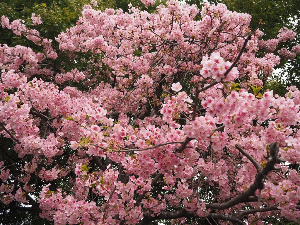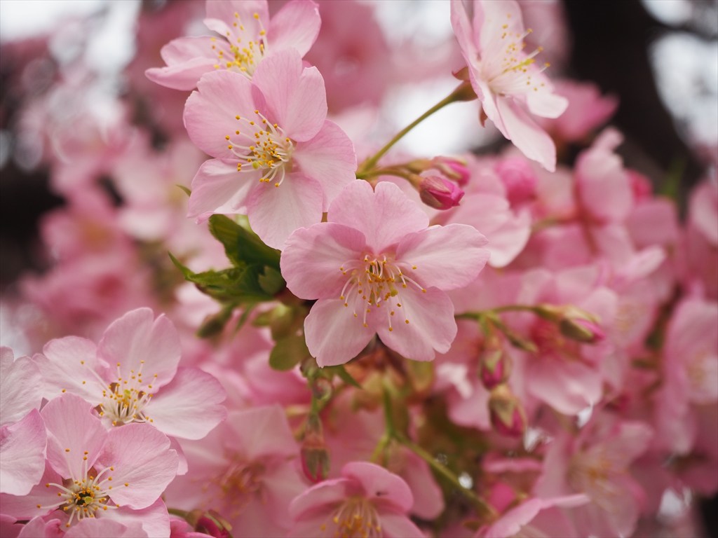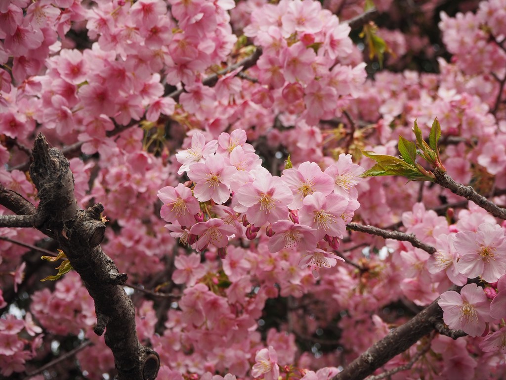 河津桜は伊豆半島原産の超早咲き桜で。ピンク色で優しい色の花を咲かせます。花が大きいオオシマザクラと、超早咲きで色が濃いカンヒザクラの交配種のため、花が大きくて、色が濃く、超早咲きという、それぞれの長所を受け継いだ桜です。