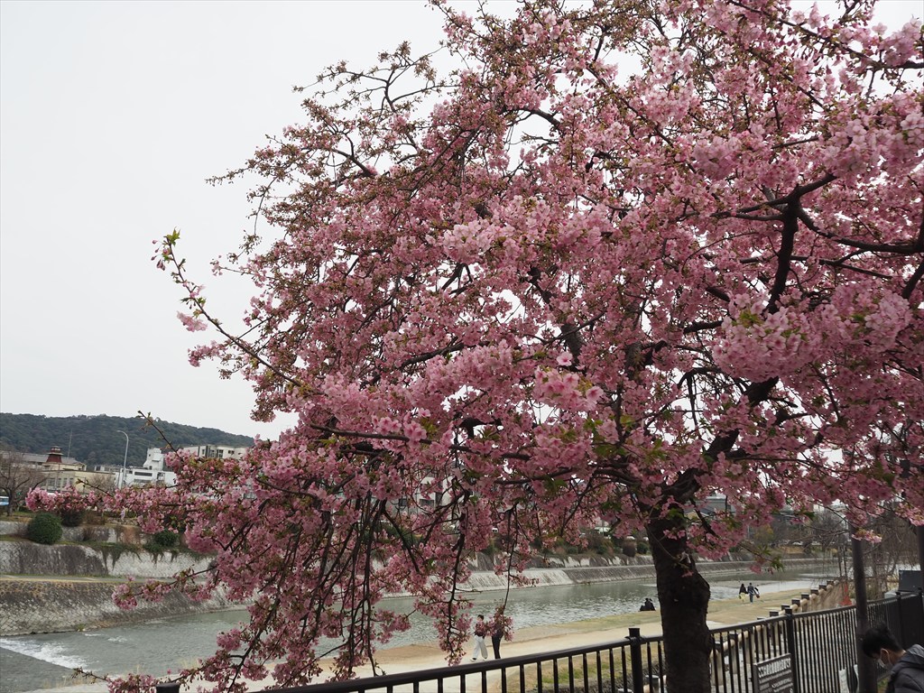 まだ発見されてから70年ほどですが、その華やかさと一足早く春を告げるところから、京都でも近年各地で植えられ、目にする機会も増えてきました。河津桜は京都では淀水路が有名ですが、一条戻り橋や三条大橋のたもと、車折神社や三十三間堂など、所々に植えられています。