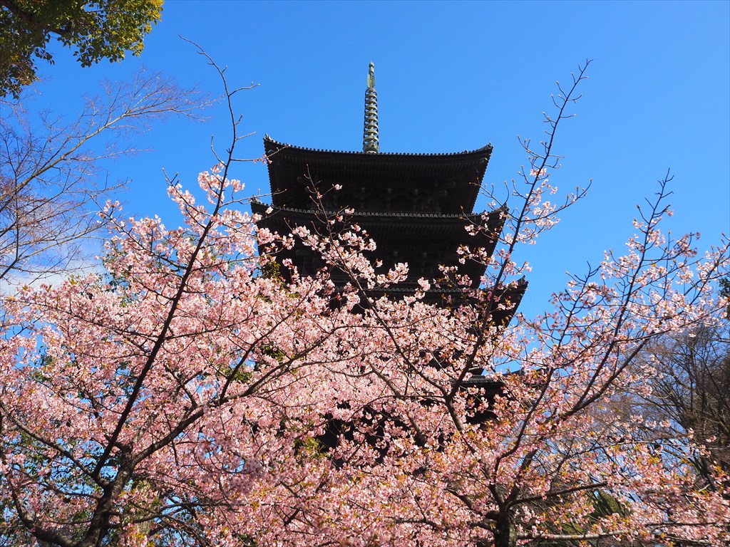 東寺の境内では河津桜も満開となっており、有料拝観エリアでは五重塔の近くで咲いています。ソメイヨシノの開花にはまだしばらくかかりますが、一足早く美しい桜を目にすることができました。