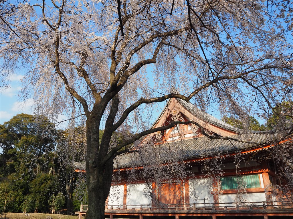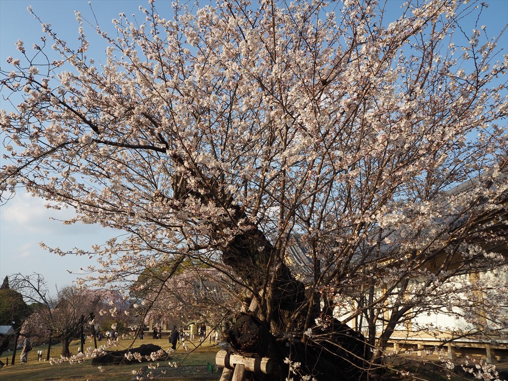 京都の早咲き桜の名所といえば桜が醍醐寺は外せません。すでに見頃を迎え、巨木の桜が立ち並ぶ様は圧巻です。天下人・豊臣秀吉が「醍醐の花見」を催したことでも知られ、境内にはその時の桜の子孫とされる巨木のしだれ桜があちらこちらに植わっています。その1本1本が、他の社寺にあれば有名になっていたに違いないと思えるほどの立派さ。有料拝観エリアの三宝院、伽藍、霊宝館のそれぞれで一級品の桜に出会うことができます。