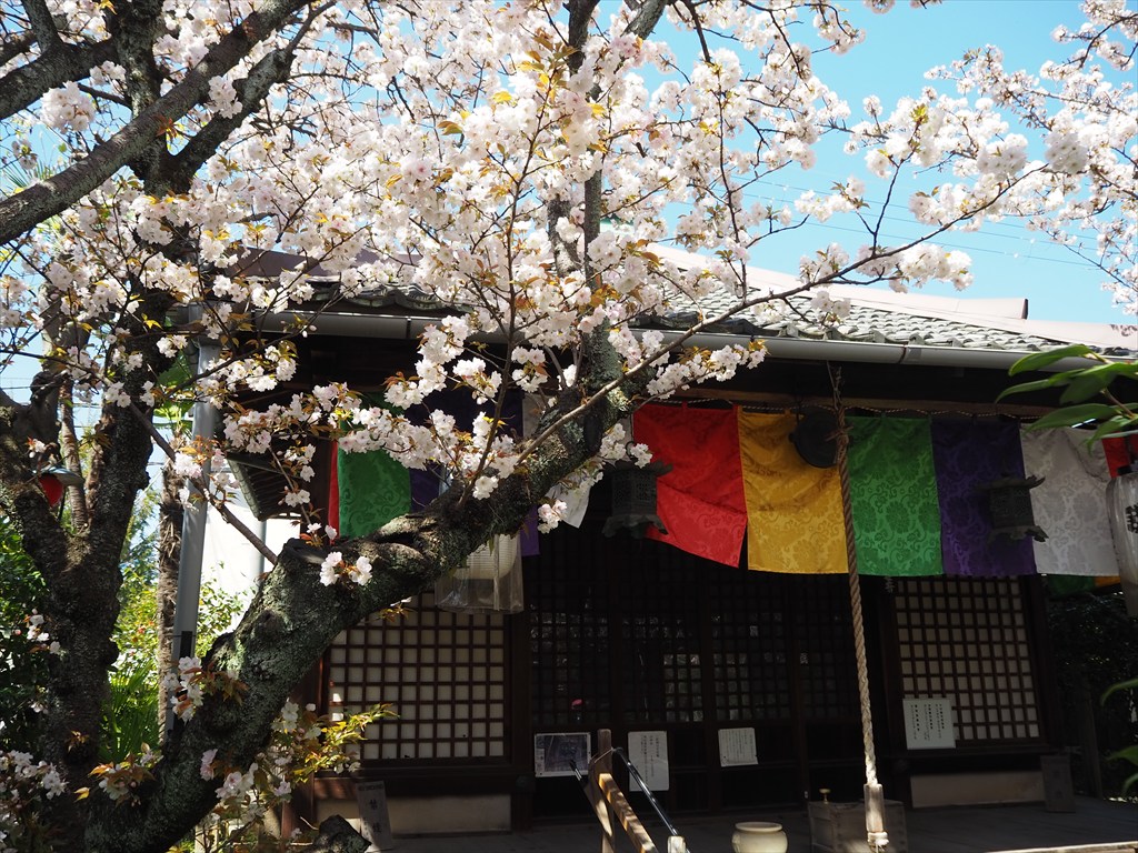 境内は他にも神仏習合の様式がみられ、歓喜天を祀る本堂の前には鳥居が立っています。観音堂、大師堂、庚申堂、不動堂、稲荷堂など、順番にお参りをされている地元の方もお見かけします。大師堂の弘法大師像は、汗をかくほど辛いことでも助けて下さるそう。桜の美しい境内ですが、時代を越えても変わらぬ篤い信仰も感じられるお寺です。