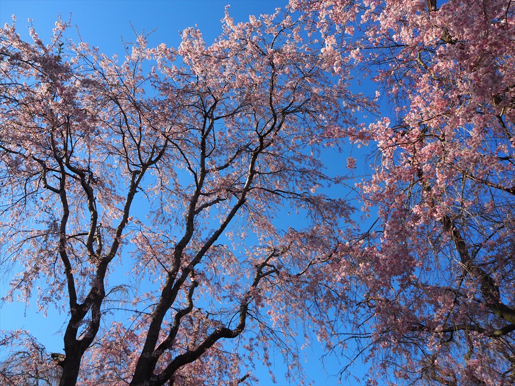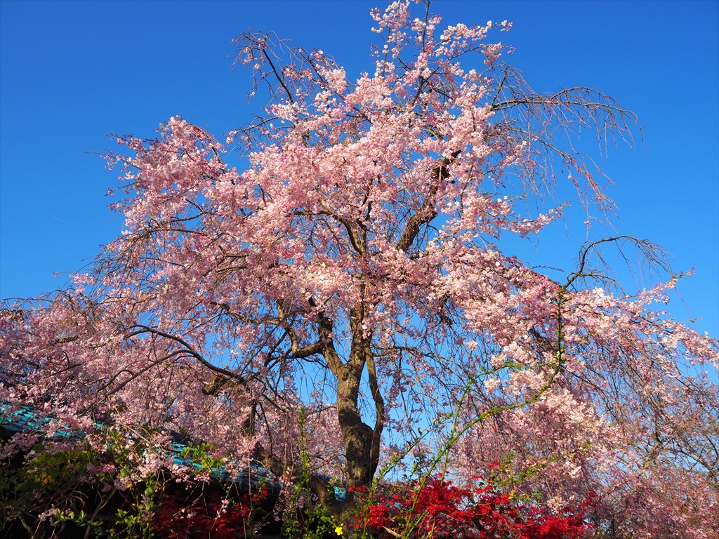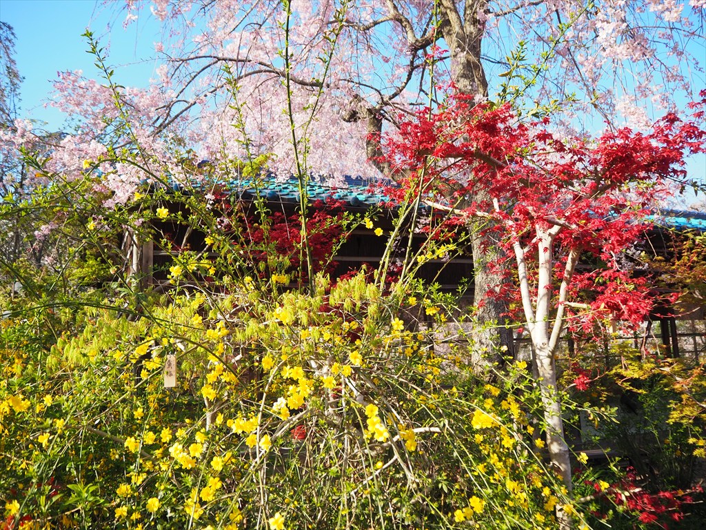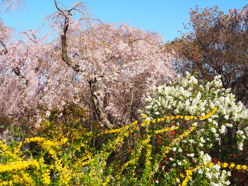さて、原谷苑の素晴らしいところは、シャワーのような紅枝垂れ桜だけでなく、足元に咲くユキヤナギやツツジ、レンギョウ、ボケなどの花々も美しいことです。上も下も見わたす限りの花花花!!これぞまさに百花繚乱!!行けども行けども花が待っています。それらの様々な色彩が、濃いピンクの紅枝垂れ桜をいっそう引き立てています。来週にかけて楽しめますので、よければ訪れてみてください。